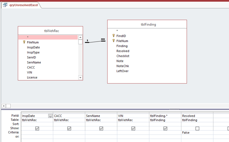 The query here is going to be called “qryUnresolvedExcel”, and its sole purpose is to gather the data necessary for the Excel export.